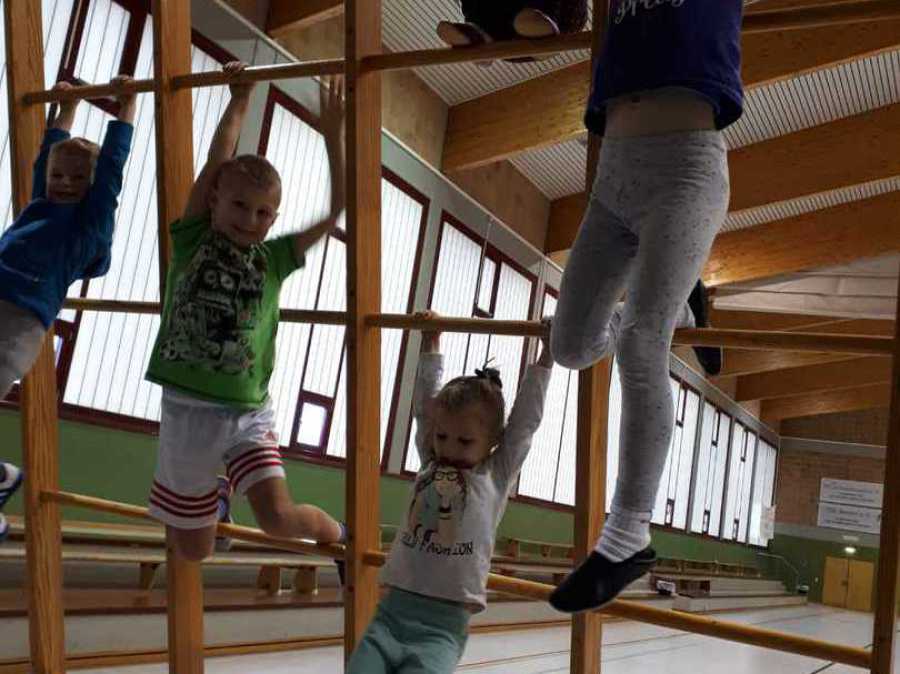 In der 60-minütigen Turnstunde werden verschiedene Turnlandschaften mit Geräten aufgebaut z.B. Mattenrutsche, Mattenschaukel, Trampolin, Seile, Ringe, u.v.m. Die Kinder können sich während der Turnstunde frei bewegen und austoben. Dabei werden die körperliche Beweglichkeit, Koordination und das Gleichgewicht geschult. |